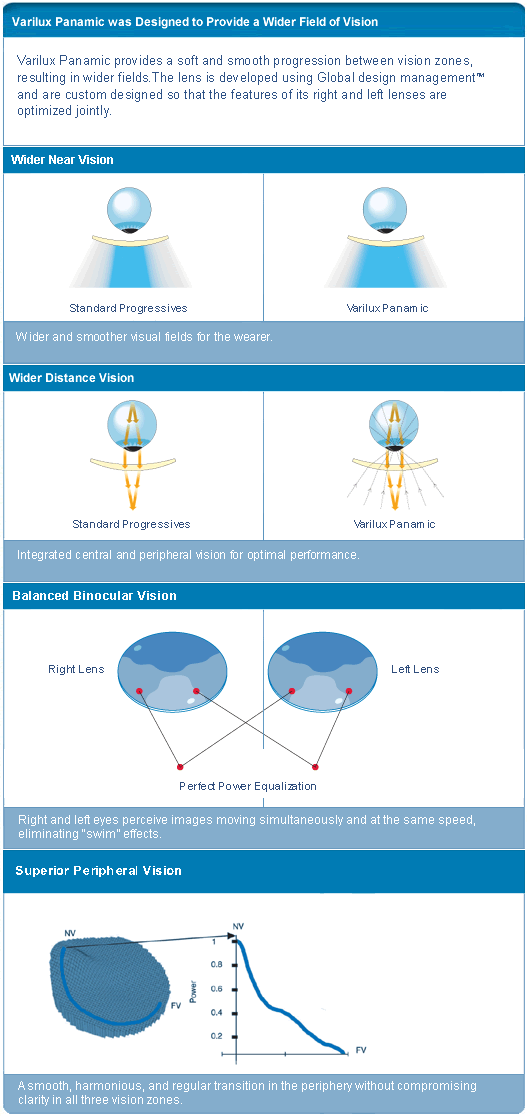 The Varilux Panamic design balances central, peripheral, and binocular vision resulting in clear fields of vision no matter where the wearer looks through the lens. The design provides excellent vision correction and wide vision fields in a thin, lightweight lens.